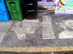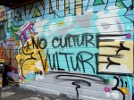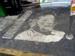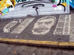 I also was able to capture sidewalk stencils of prominent revolutionaries – Malcom X, Emiliano Zapata, Emma Goldman on the west side sidewalk of the Revolutionary Cafe.. I also shot the current state of the cafe’s controversial west side mural where someone sprayed “Stop The Culture Vulture” over the work of Simon Norris who painted over a long-standing mural by local artist SPIE. To read about the controversy go here: http://missionlocal.org/2010/06/mission-community-market-mural-vandalized.